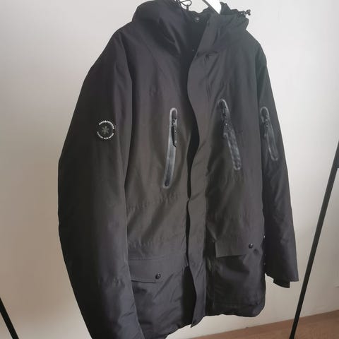Áhkká miesten talvitakki, koko M. Musta takki, jossa lämmin untuvatäyte. Takki on erittäin hyvässä kunnossa vähäisen käytön vuoksi. Takissa on irrotettava ja säädettävä huppu, täyspitkä vetoketju ja nepparilista. Kiristysnauha helmassa. Useita ulkotaskuja. Alataskut neppari ja vetuketjukiinnityksellä, Lisäksi povitasku. Ei reikiä, tai rikkeymiä. Väri on kuvissa haaleampi, kuin todellisuudessa. Ensimmäisessä kuvassa, jossa takin vetoketju on auki sävy on aidoimmillaan.