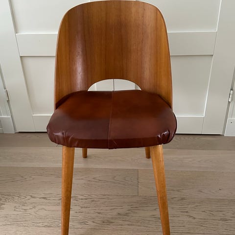 Vanha (50-60-luvun?) siro teak-tuoli, jossa ajan patinaa, mutta yleisilmeeltään siisti. Istuinkorkeus 45 cm, leveys 45 cm ja tuolin koko korkeus 78 cm. Päällystetty lapualaisen Annala Kutomon Cepra-kankaalla, jonka voi halutessaan helposti vaihtaa.