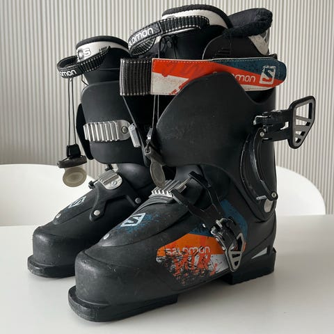 Salomon F20 laskettelumonot, koko 29. Väri musta/harmaa. Monoissa neljä solkea ja leveä tarrakiristys varressa. Kova kuori ja pehmustettu sisäkenkä tukevat jalkaa rinnelaskussa. Sopivat alppisukseen perinteisiin siteisiin. Koko 29 vastaa noin 29 cm jalan pituutta (mondopoint-mitoitus). Käytön jälkiä, muuten kunnossa. Jääneet pieneksi.
