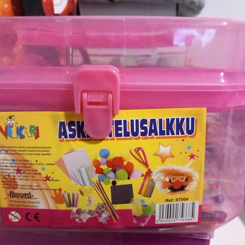 Askartelusalkku lasten askartelusetti vaaleanpunainen. Salkussa on muovinen vaaleanpunainen kotelo, jossa on kantokahva ja lukittava salpa. Sisällä on erilaisia askartelutarvikkeita, kuten puisia tikkuja, pompom-palloja, vaahtomuovikuvioita ja muita pientarvikkeita. Sopii lasten askarteluun ja erilaisten pienten askarteluprojektien tekemiseen. Salkku pitää tarvikkeet yhdessä ja on helppo kuljettaa ja säilyttää.