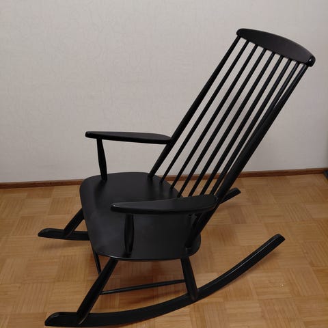 Ihana retrokeinutuoli seuraavaan kotiin kiikkumaan. Vahvaa tekoa, kaikki liitokset ehjät. Ajanpatinaa on: maalipinta paikoin kulunut ja käytönjälkiä löytyy.