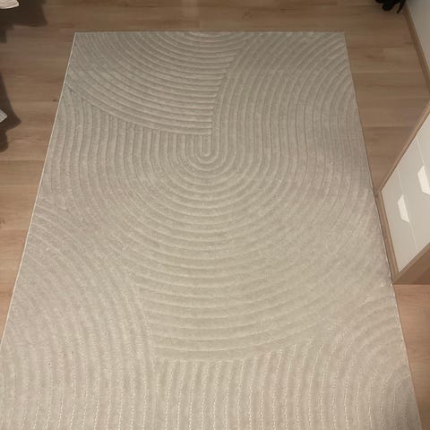 Jysk matto, jossa harmaa pohjaväri ja valkoinen aaltomainen kuviointi. Matossa on kudottu tausta ja reunakanttaus. Sopii käytettäväksi esimerkiksi olohuoneessa, makuuhuoneessa tai eteisessä. Materiaali vaikuttaa olevan konekudottua tekokuitua (tarkka materiaali ei tiedossa).