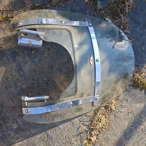 Givin tuulisuoja kiinnikkeillä. Toisen kiinnikkeen kohdalla muovissa pieni halkeama.