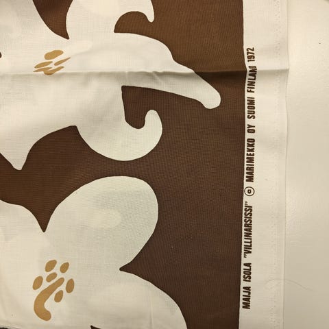 Myydään upea, aito Marimekko "Narcissos" -kuosinen kangas vuodelta 1977. Tämän klassikkokuosin on suunnitellut Maija Isola. Kangas on käsin painettu Suomessa, mistä todisteena kankaan reunassa oleva merkintä "MARIMEKKO OY 1977 SUOMI-FINLAND MAIJA ISOLA: NARCISSOS".