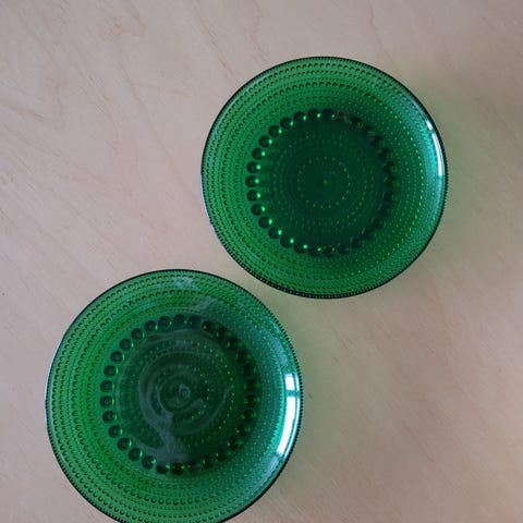Myydään 6 kpl kirkkaita Kastehelmi-sarjan aluslautasia. Halkaisija 85 mm. Kaikissa Iittalan tarrat. Suunnittelija Oiva Toikka. Valmistettu vuosina 1970-1987. 10 euroa/kpl.