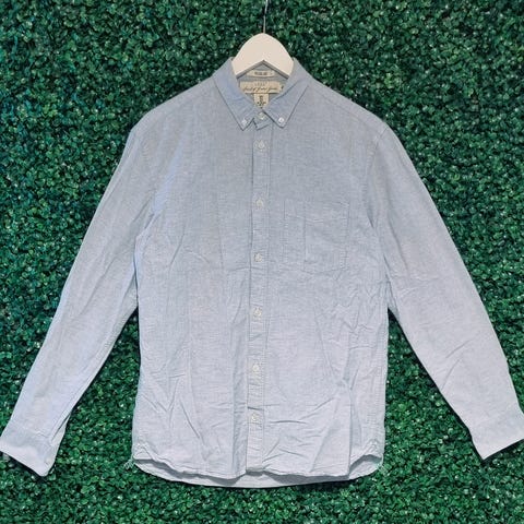 H&M slim fit miesten vaaleansininen kauluspaita. Koko M. Materiaali 65% polyesteria ja 35% puuvillaa. Pitkät hihat, nappikiinnitys edessä ja perinteinen kaulus. Hyvin ohut materiaali, josta kuultaa läpi. Kaulus hieman tummunut käytössä, ja alkanut nukkaantumaan. Vaatii siistimistä.
