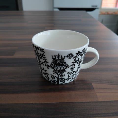 Muuttomyynti ❤️ Iittala Taika muki. Valkoinen posliinimuki, jossa monivärinen koristekuviointi pöllö- ja puuaiheilla.