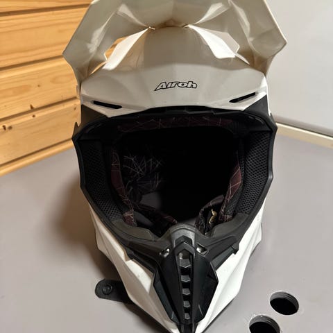 Airoh TX kypärä koossa XL. Väri on punamusta graafisella kuviolla. Kypärä on umpimallinen, leukasuojalla varustettu malli, joka soveltuu esimerkiksi motocrossiin tai enduroon. Sisäosat ovat pehmustetut ja leukahihna on säädettävä. Mukana erilliset suojalasit, joissa on kirkas linssi ja mustavalkoinen kehys sinisellä yksityiskohdalla.
