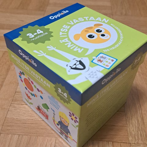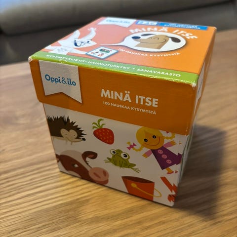 Oppi&ilo Minä itse kysymyskortit 2-3 vuotiaalle. Kortit vielä pääosin siistissä kunnossa. Yhteensä laskettiin olevan 99 eli yksi on karannut jonnekin.
