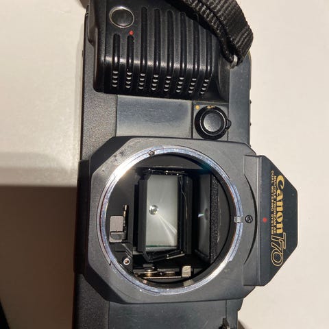 Canon T70 filmikamera. Mukana objektiivi, kaksi erillistä salamaa (Canon Speedlite 277T ja Toshiba-salama), kamerahihna, käyttöohjeita sekä pehmustettu kameralaukku. Kamera käyttää 35 mm filmirullia. Sopii filmikuvausta varten ja varusteet mahdollistavat kuvaamisen erilaisissa valaistusolosuhteissa sekä kameran kuljettamisen laukussa.