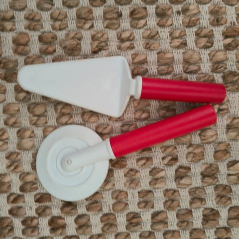 Puinen pizza keittiö leikkeihin. Kaikki täytteet ja palat tallella. Siisti kunto. Tarrat napakat. Veitsi leikkaamiseen ja alusta.