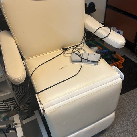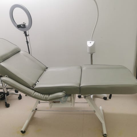 Säädettävä hoitotuoli mustaa keinonahkaa. Tuolissa on pehmustettu istuin- ja selkäosa sekä erillinen jalkatuki, jotka voidaan säätää eri asentoihin mekaanisilla vivuilla. Selkänojan yläosassa on aukko, joka soveltuu esimerkiksi kasvojen tukemiseen makuuasennossa. Runko on metallinen ja tuoli seisoo neljällä jalalla. Sopii kauneudenhoitoon, tatuointiin tai muuhun hoitotyöhön, jossa tarvitaan säädettävää makuu- ja istuma-asentoa tarjoavaa tuolia.