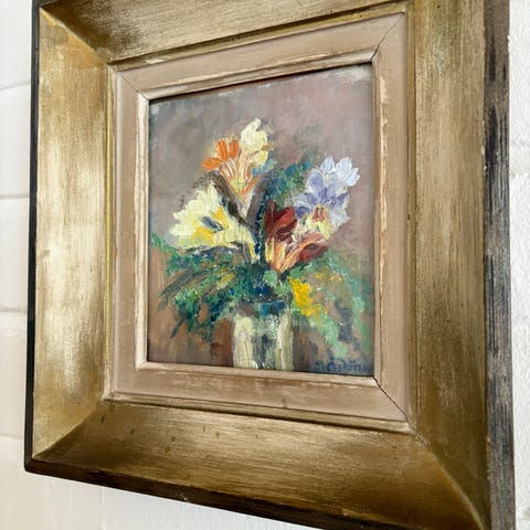 Marja Leena Vuorisen signeeraama taulu kehäkukkia. Öljyvärityö kankaalle vuodelta 1975. Koko kehyksineen 53 x 69 cm.
