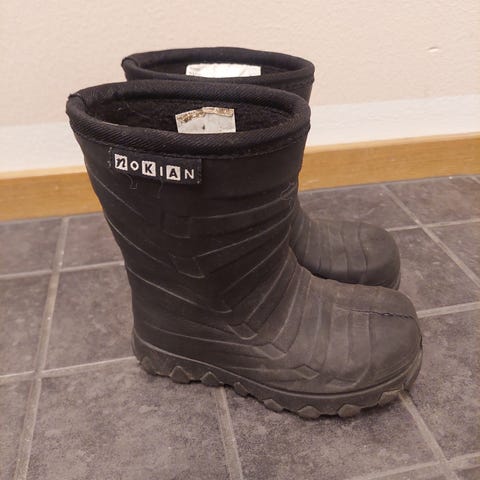 Nokian lasten kumisaappaat, koko 22. Väri musta, unisex-malli. Saappaissa on kumipintainen ulkopuoli ja sisäpuolella karvavuori. Pohjassa on karkea kuviointi, joka antaa pitoa märällä ja liukkaalla alustalla. Ollut yhdellä lapsella muutaman kerran jalassa, ostettu uutena Etolasta 39,90€.