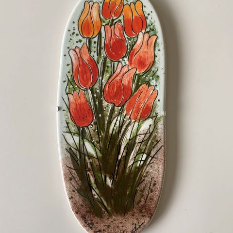 Heljä Liukko-Sundströmin Arabialle suunnittelema "Tulppaaneja tulvillaan" -seinälaatta. Koko n. 32x13 cm.