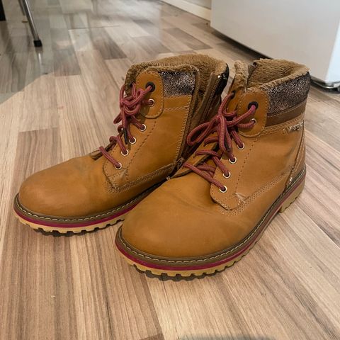 Wrangler talvikengät, koko EU 38 (UK 5). Nauhakiinnitys, kuvioitu kumipohja, joka tarjoaa hyvän pidon. Väri vaalea beige. Sisäosa pehmeästi vuorattu. Sopivat talvikäyttöön ja arkiseen ulkoiluun. Hieman reilut 38 koon kengiksi.