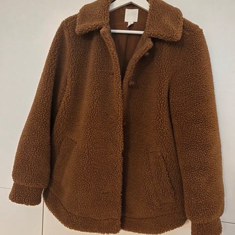 FB sister ruskea teddytoppatakki. Edessä vetoketju, sivuilla taskut. Todella lämmin. Koko M, mitoitukseltaan kuitenkin oversize