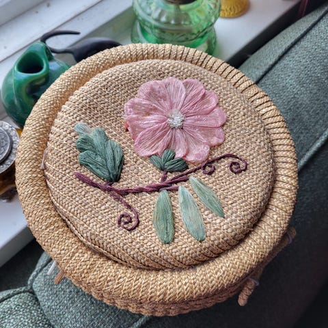 Retro käsityötarvikerasia kori kukkakuvio punottu säilytysrasia säilytyslaatikko sisustus korurasia