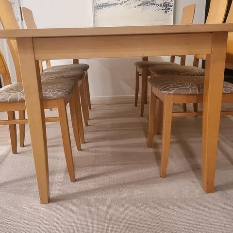 Tuolit: istumakorkeus 44 cm, korkeus selkänojalla 90 cm, istuimen leveys edessä 43 cm ja takana 36 cm, istuimen syvyys 37 cm (koko syvyys 42 cm). Tuolit on pehmustettu kankaalla, jonka värin nimi on sesame. Kangas on erittäin hyvää. Kankaissa ei ole kulumia eikä tahroja. Muutamissa tuoleissa on istuinosassa takana pieniä naarmuja tai hankaumia, jotka ovat tulleet aikoinaan farkuista, joissa oli vetoketjut takataskuissa. Ne on maalattu eivätkä ole hirveästi huomattavissa.