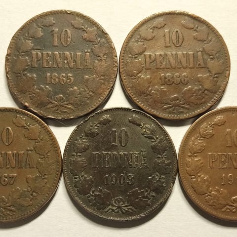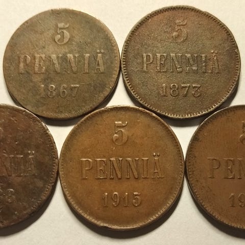 Kuvien kolikot, 5 penniä 1867, 1889, 1908, 1915, 1916 ja 1917, lisäksi 10 penniä 1865. Kunnot huonosta hyvään, klikkaa kuvat. Myydään yhteishinnalla 10,00 eur. Toimituskulut hyvin pakattuna kirjeenä 3,90 eur.