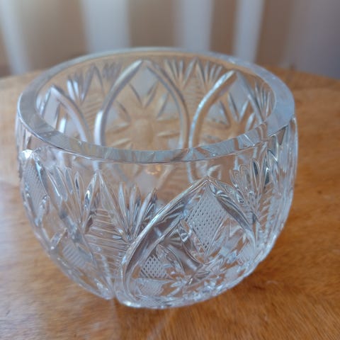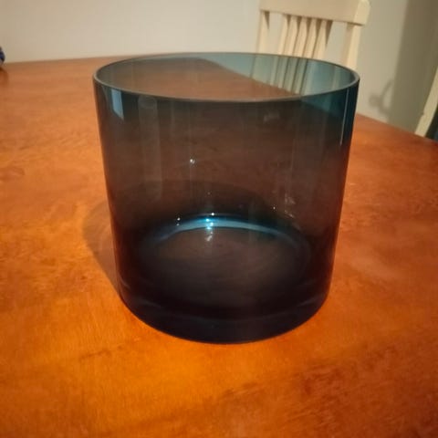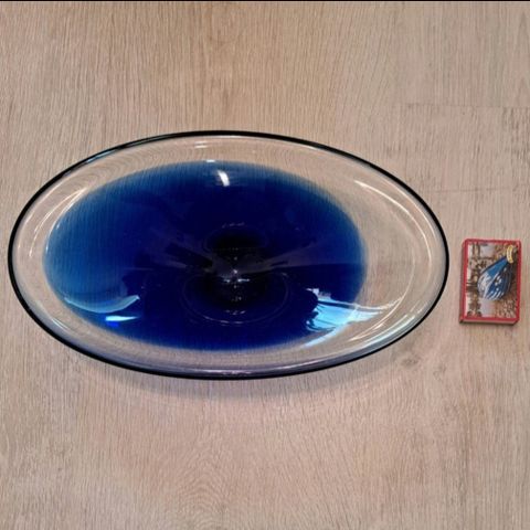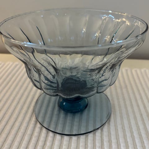 Vaaleansininen lasikulho, jossa on hiottu rypäle/köynnos koriste. Kulho on pyöreä ja siinä on leveä reuna.