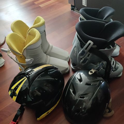 Monot kypärä ja sukset.
