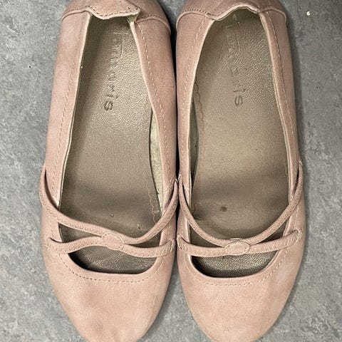 Tamaris ballerinat, koko 41. Väri musta. Päällinen sileää nahkaa, sisäpohjassa nahkamerkintä. Pyöreä kärki ja pieni rusetti edessä. Kumipohja, jossa uritettu pinta. Sopivat arkeen ja siistimpään käyttöön.