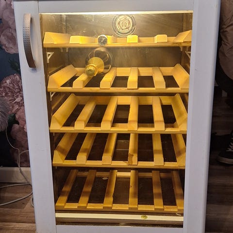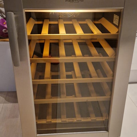 Kotikylmiö Festivo 45 viinikaappi. Kapea, korkea viinikaappi, jossa lasiovi ja useita puisia hyllyjä viinipullojen säilytykseen. Alhaalla on erillinen vetolaatikko juomien tai muiden tuotteiden kylmäsäilytykseen. Laitteen tyyppikilven mukaan malli on 0108 Festivo 45, käyttöjännite 230 V, 50 Hz ja tehonkulutus 120 W. Viilennysaineena R134A. Soveltuu viinien ja muiden juomien säilyttämiseen tasaisessa lämpötilassa kotikäytössä tai pienissä tiloissa, joissa tarvitaan kapeaa viinikaappia.