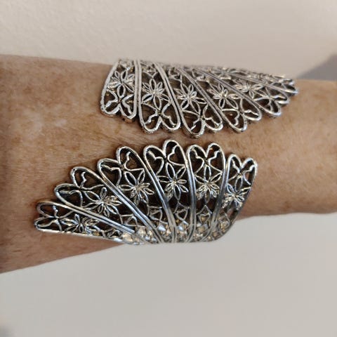 Myydään harmaa-musta rannekoru. Uuden veroinen ehkä sekä siisti. Koko pituus 23,5cm. Leveys 3,5cm. Materiaalista ei tietoa.
