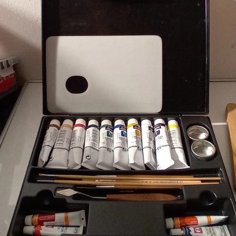 Maalaustarvikesetti, johon kuuluu useita akryylivärituubeja eri sävyissä, useita erikokoisia siveltimiä, kaksi valkoista maalauspohjaa, muovinen paletti useilla lokeroilla, vesikuppi sekä muovinen palettiveitsi. Sopii akryylimaalaukseen ja erilaisten maalaus- ja harjoitustöiden tekemiseen kotona tai harrastuskäytössä.