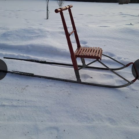 Esla potkukelkka vaikka pilkki kelkaksi tms. Ehjä ja aisan korkeus noin 80cm.