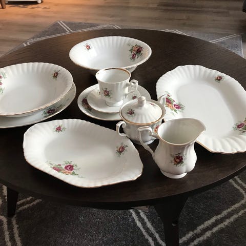 6kpl kahvi kupit, 6kpl lautaset,2 kpl kulhot , joitakin pieniä jälkiä voi olla.