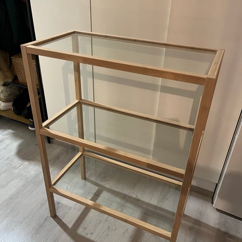 Kehikko mustaa metallia, hyllyt lasia. Kevyt hyllykkö esim. koriste-esineille. Hinta 30€/kpl tai molemmat yht. 50€.