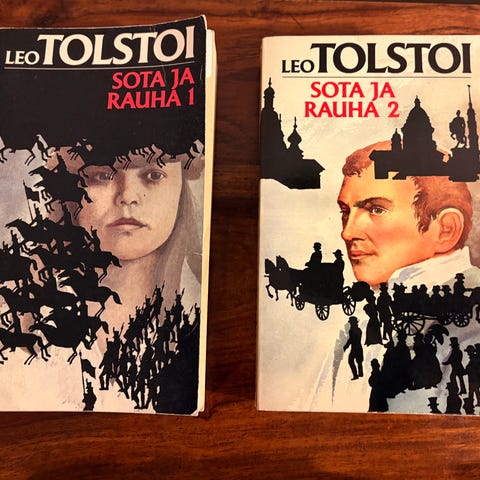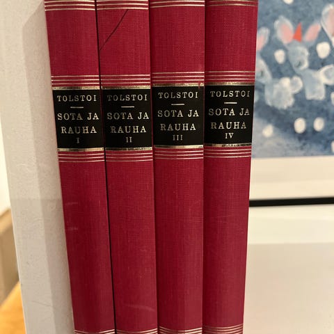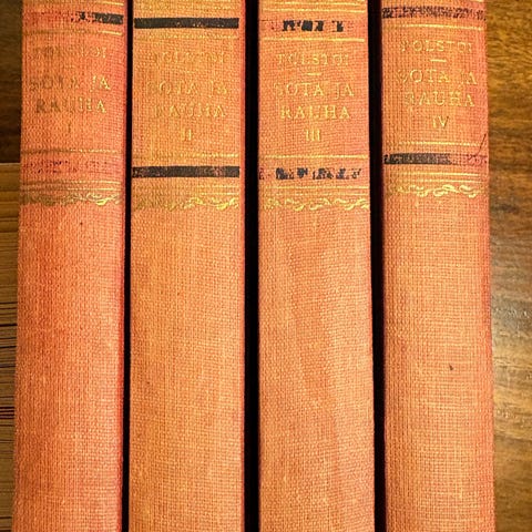 Tolstoy: Krig och fred I-IV (täydellinen kirjasarja), Bonniers 1889, ruotsinkieliset, noin 400 sivua jokaisessa osassa, kovakantiset, hyväkuntoiset!