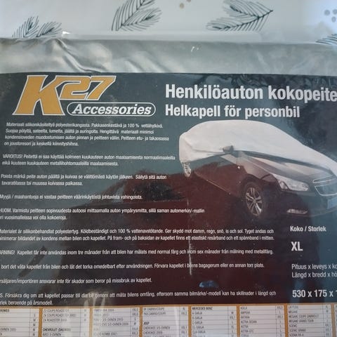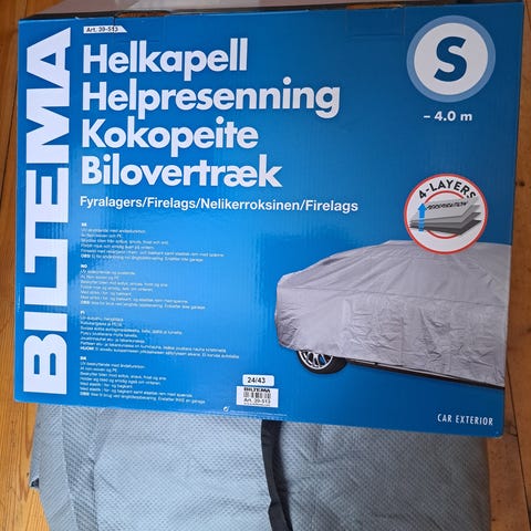 Biltema helkåpe helpeite kokopeite koossa L. Auton kokopeite suojaa ajoneuvoa pölyltä, lialta ja säältä. Peite on tarkoitettu auton koko rungon peittämiseen säilytyksen ajaksi. Väri tumma, materiaali säänkestävää kangasta. Soveltuu henkilöautolle, jonka mitat ovat pakkauksen mukaan noin 485 x 178 x 120 cm (L-koko).