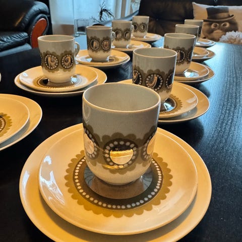 Arabian 1970-luvun Tanja-sarjan astioita, suunnitellut Esteri Tomula. 6 kpl kuppeja, kahvilautasia ja isompia kahvilautasia. Yhdessä kupissa sekä yhdessä isommassa kahvilautasessa pieni kolo, hinta laskettu viiden ehjän setin mukaan.