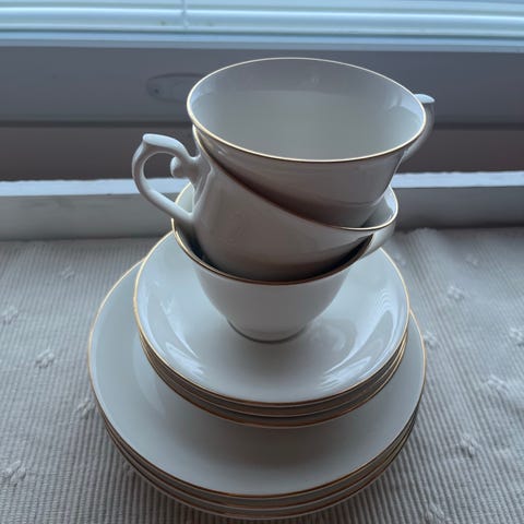 Arabia kahviastiasto. Valkoiset posliiniastiat kultareunalla. Siisti kunto