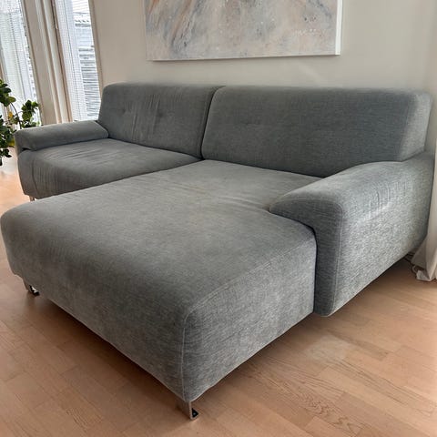 Harmaa U sohv, jossa kangasverhoilu. Sohvassa on useita istuin- ja selkätyynyjä sekä kulmaosa.Verhoilu on irrotettavissa tyynyistä vetoketjujen avulla. Muutaman tyynyn vetoketju hajalla, mutta ei haittaa käyttöä. Tämän saa siis yhdeksi isoksi kokonaisuudeksi tai näin kahdessa osassa kuten meillä. Näkyvät puuosat olen peittänyt viltillä. Vaatii tilaa kokonaisuutena. "Kulma" sohvan divaani osa irti, mutta käden taitoisellw korjattavissa.