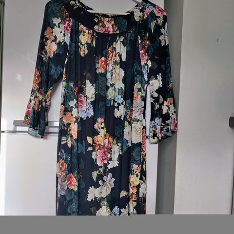 Mitat: 1/2 -leveys (kainalosaumasta toiseen) 55cm, pituus (olkasaumasta helmaan) 90cm ja hihanpituus olkasaumasta 56cm.
