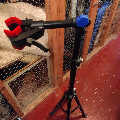 Säädettävä polkupyörän huoltoteline kolmijalkaisella jalustalla. Telineessä on korkeussäätö ja kääntyvä vaakapuomi, jonka päässä on puristin pyörän rungon kiinnittämistä varten. Puristimessa on käsikäyttöinen vipulukitus. Vaakapuomissa on lisäksi pieni työkalutaso pientarvikkeille. Soveltuu polkupyörän huoltoon ja säätötöihin sisätiloissa tai tasaisella alustalla.