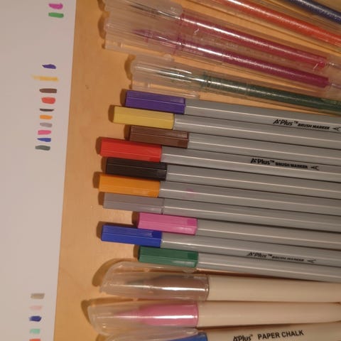 Myyn samassa setissä myös Ohuhun Akaka-akryylitussit. Joitakin tusseja on käytetty paljon, mikä voi näkyä varsinkin sivellin kärjessä. Tusseissa tosiaan sivellin ja hieno kärki. Tussien kunto välillä tyydyttävä-erittäin hyvä, riippuen tussista.