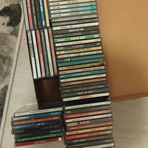 Sekalainen erä CD-levyjä erilaisilta artisteilta ja yhtyeiltä. Levyjä on useita kymmeniä, ja ne ovat muovisissa CD-koteloissa. Sopii esimerkiksi musiikin kuunteluun kotona, autossa tai kokoelman täydentämiseen. Tarkempi sisältö vaihtelee, kuvista saa yleiskuvan osasta levyistä ja artisteista.