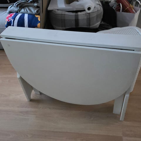 Hienokuntoinen taittopöytä, pöytälevy valkoinen ikilevy, Mitat molemmat puolet avattuna leveys/syvyys 115/80cm, korkeus 74cm. Vain toinen puoli ylhäällä lev/syv 65/80 cm.Menee todella pieneen tilaan.