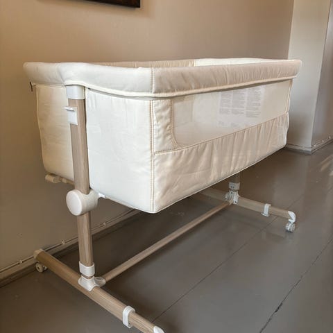 Trollin Sun Bedside Crib. Valkoinen vauvan sänky, jota voidaan käyttää sekä erillisenä kehtona että aikuisten vuoteeseen yhdistettynä toinen laita alas laskettuna. Tosi näppärä ollut käytössä kun voi säätää korkeutta ja imetys yöllä nopeaa kun pystyi pitämään vauvan ihan sängyssä kiinni ja nostaa sieltä suoraan kainaloon ja laittaa takaisin jatkamaan unia :)
