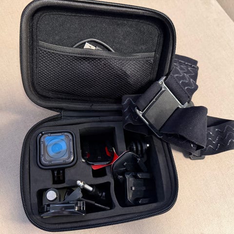 GoPro actionkamera mustana. Mukana useita kiinnikkeitä ja hihnoja, kuten rinta- ja pääkiinnike sekä jatkovarsi/selfiekeppi. Settiin sisältyy myös säilytyskotelo ja pieniä lisävarusteita, kuten ruuveja ja kiinnitysosia. Sopii esimerkiksi urheilun, ulkoilun ja matkailun kuvaamiseen yhteensopivien GoPro-kiinnikkeiden kanssa.
