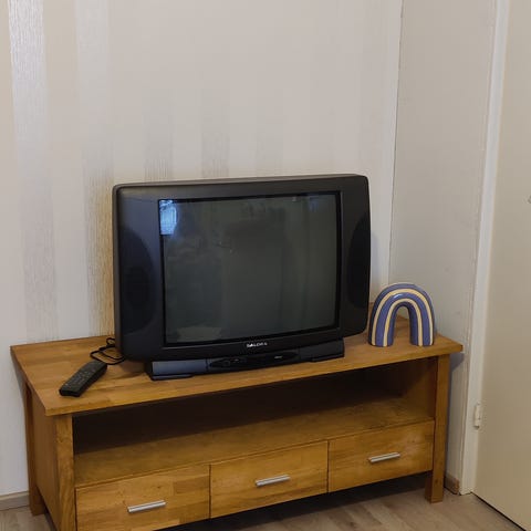 Todella hyväkuntoinen tv-taso, jossa hyllyjen ja kaapinpaikka muunneltavissa. Täyspyökkiä 2000 -luvun taitteesta. Valitettavasti malliston nimeä en muista, mutta siisti on.