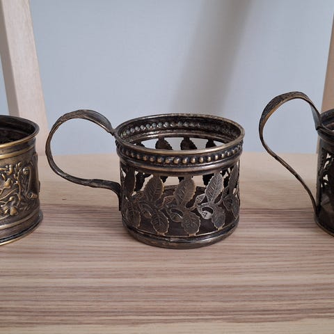 Metallinen koristeellinen teelasiteline, yhteensä 4 kappaletta. Telineissä on kaareva kahva ja koristeellinen, kaiverrettu pinta. Soveltuvat esimerkiksi lasisten teekuppien tai -lasien pidikkeiksi. Materiaali on metallia, pinnassa hopean- ja kullanvärisiä sävyjä. Pohjassa on valmistajan leima. Sopivat käyttöön tai kattauksen osaksi.