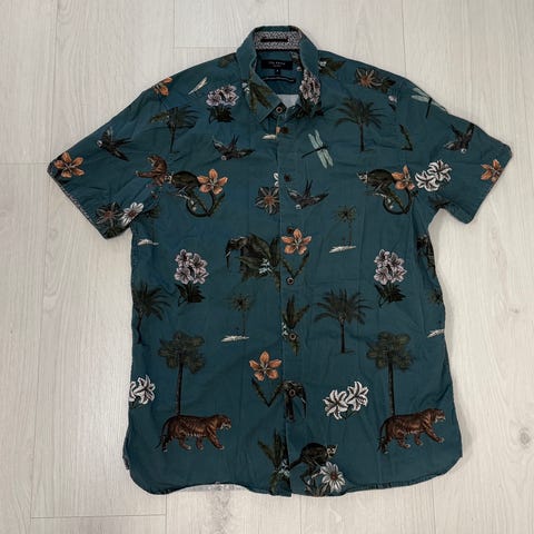 Ted Baker miesten kauluspaita, koko M. Materiaali puuvillaa. Paita on lyhythihainen ja siinä on monivärinen, kirjava kuosi, jossa eläin- ja kasviaiheisia kuvioita vaalealla pohjalla. Soveltuu arkikäyttöön ja siistimpään pukeutumiseen.