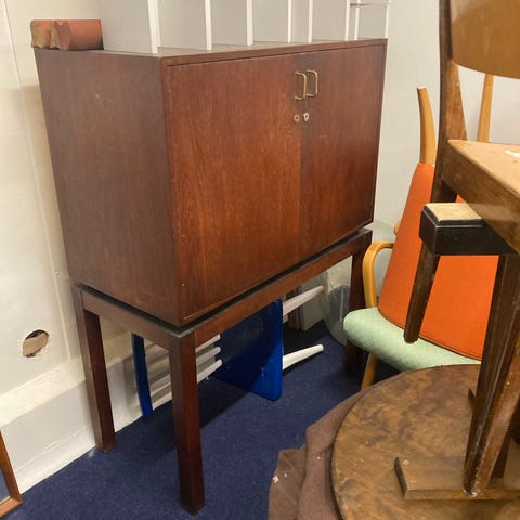 Borgin vuonna 1955 suunnittelema tiikkinen senkki, Askon tuottamana. Ikäisekseen huippu vintage kunnossa, ovissa ja senkin sivuissa pientä kulumaa, päällinen entisöity. Lopussa kuvat moitekohdista. Takaseinässä porattu johtoja varten reikiä.