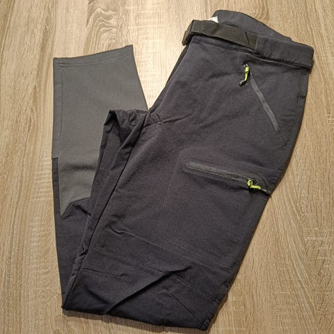 Aivan uudenveroiset mustat H&M vuorittomat ulkoiluhousut. Lahkeissa kuminauha nepparisäädöin. Takamuksen päällä lipan alla tuuletusaukko. Avotaskut sekä reidessä pieni vetoketjutasku. Koko 40. Mitat vyötärö edestä 44cm, sisälahje 82cm, haara-vyötärö edestä 28cm. Normaali vyötärön korkeus. Vyötärö ei jousta, mutta muuten joustavaa materiaalia.